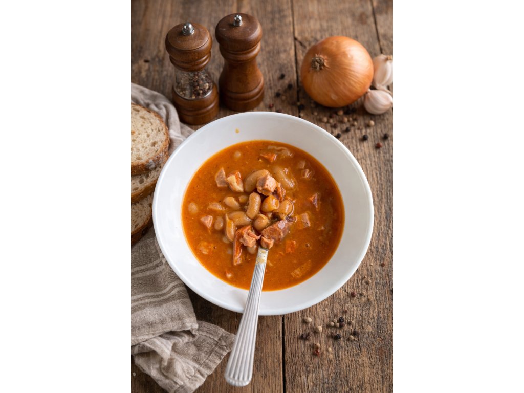 Hustá a výživná fazuľová polievka pripravená z mäsa, kvalitnej fazule, zeleniny, jemne korenená pre bohatú chuť.
