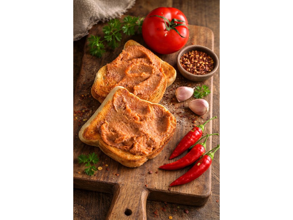 Nátierka s poriadnym šmrncom! Kombinácia bravčového mäsa, pečene a pálivej papriky vytvára výraznú a pikantnú chuť, ktorú si obľúbia milovníci ostrejších pochúťok. Skvelá na chlieb, pečivo či do sendvičov.